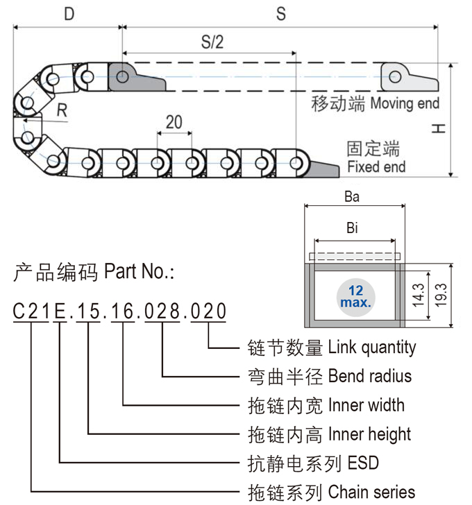 C21E.15抗静电可打开微型电缆拖链体积较小,基于两片式设计重量轻特别适用于高速运动;C21E.15抗静电可打开微型电缆拖链适用于较小安装空间,4种内宽规格可选...