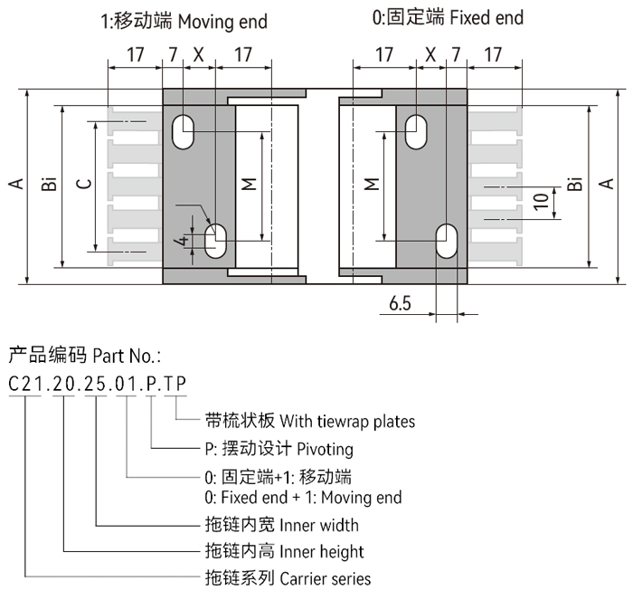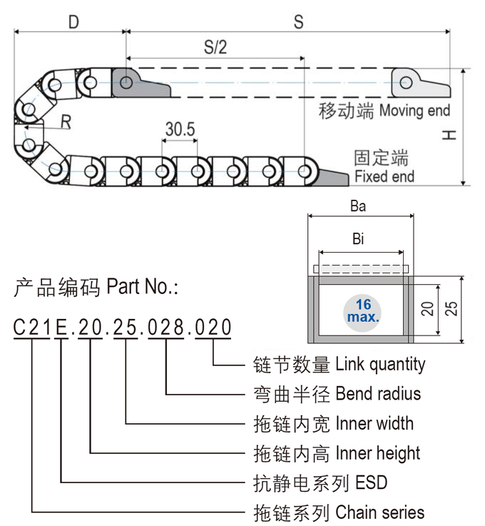 C21E.20抗静电可打开微型电缆拖链体积较小,基于两片式设计重量轻特别适用于高速运动;C21E.20抗静电可打开微型电缆拖链适用于较小安装空间,4种内宽规格可选...