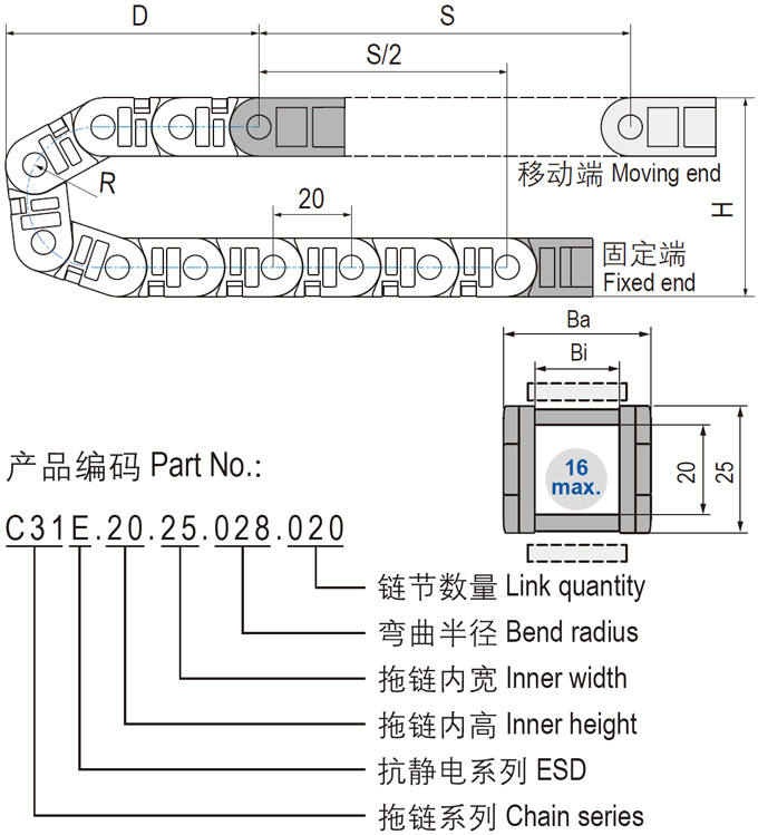 C31E.20抗静电微型电缆拖链可沿内侧或外侧打开,坚固耐用和多种打开方式设计,适用于高速运动。C31E.20抗静电微型可打开电缆拖链适用于较小安装空间,多种内宽规格可选。