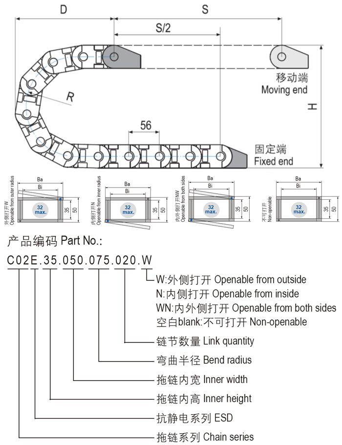 C02E.35抗静电通用型塑料拖链是应用范围广泛的产品,简单而多功能的组装结合坚固性,高强度配合更安静的运动,更长的电缆寿命和许多安装选项