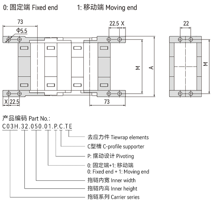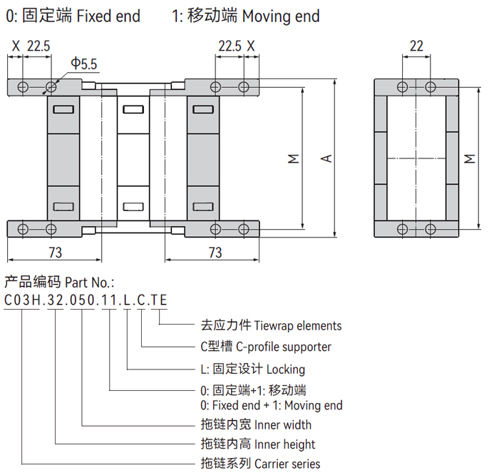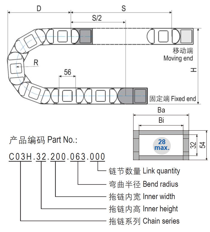 C03H高强度电缆拖链是基于C03电缆拖链的改进版本。高强度材料结合稳固的结构设计使得C03H具有更高的承载能力,特殊横杆设计赋予了拖链内宽尺寸高自由度选择。