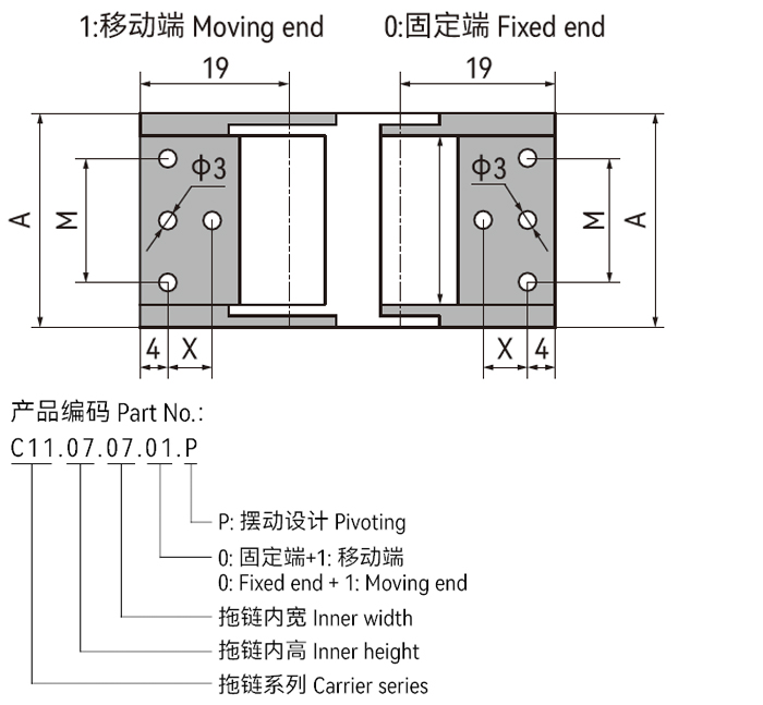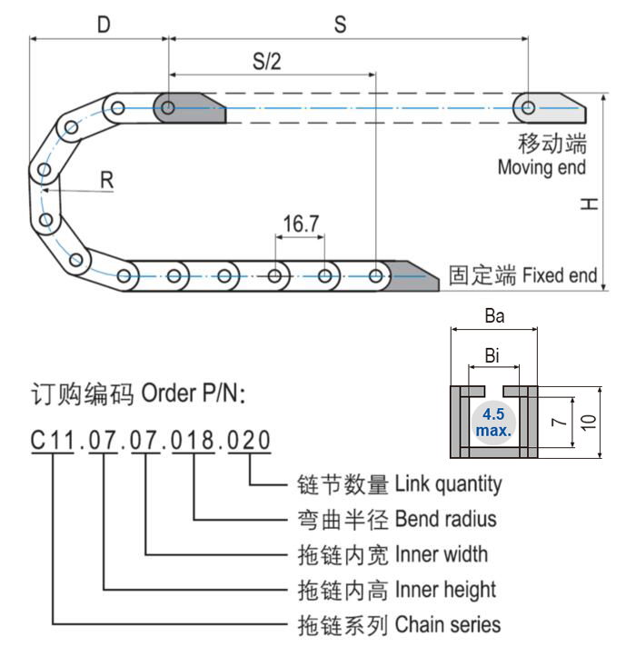 C11.07微型塑料拖链体积极小,基于一片式设计重量轻特别适用于高速运动。C11.07微型塑料拖链适用于较小安装空间,多种尺寸规格可选。