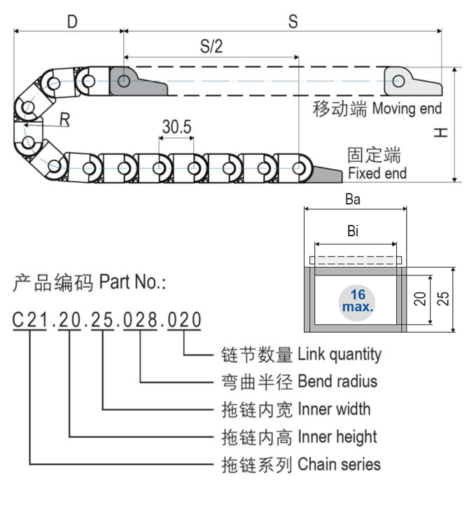 C21.20微型可打开式电缆拖链体积较小,基于两片式设计重量轻特别适用于高速运动;C21.20微型电缆拖链适用于较小安装空间,3种内宽规格可选...
