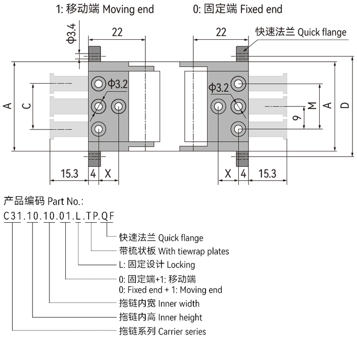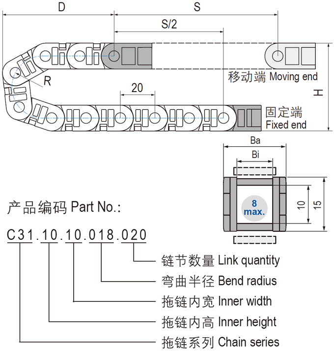 C31.10微型电缆拖链可沿内侧或外侧打开,坚固耐用和多种打开方式设计,适用于高速运动。C31.10微型可打开电缆拖链适用于较小安装空间,多种内宽规格可选。