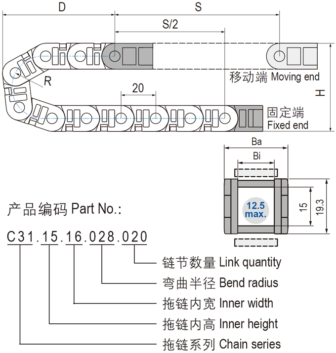 C31.15微型电缆拖链可沿内侧或外侧打开,坚固耐用和多种打开方式设计,适用于高速运动。C31.15微型可打开电缆拖链适用于较小安装空间,多种内宽规格可选。