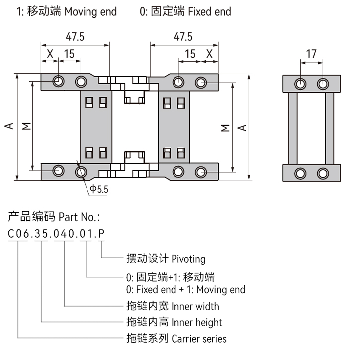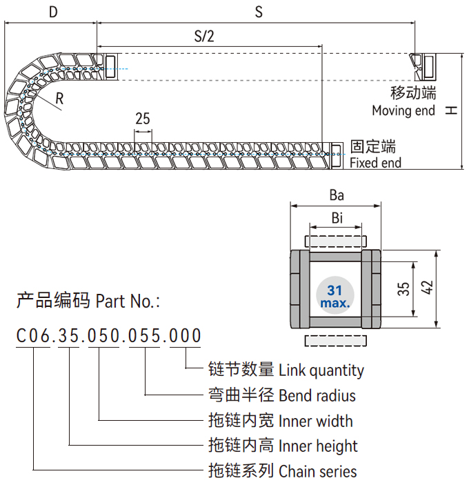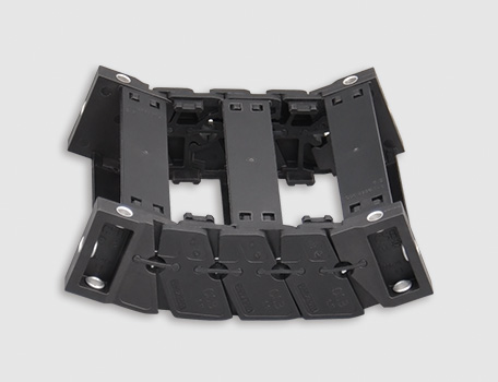 C06.35轻音型电缆拖链采用特殊结构设计,使用寿命长;由于拖链采用圆弧外形设计以及短节距链节采用弹性元件连接降低了拖链弯转过程中的振动,适合低噪音、高速与无尘室应用。