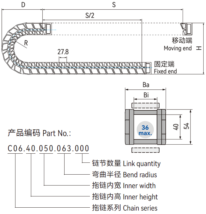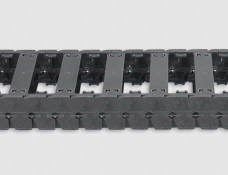 C06.40轻音型电缆拖链采用特殊结构设计,使用寿命长;由于拖链采用圆弧外形设计以及短节距链节采用弹性元件连接降低了拖链弯转过程中的振动,适合低噪音、高速与无尘室应用。