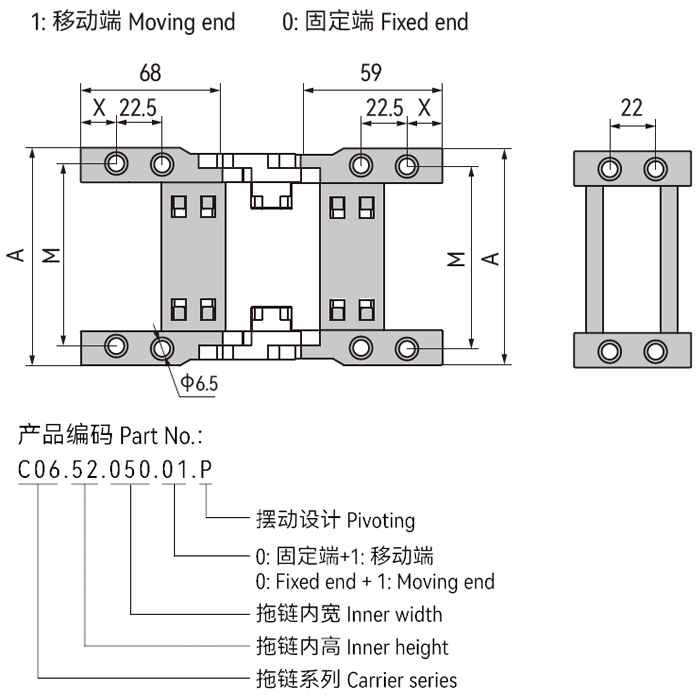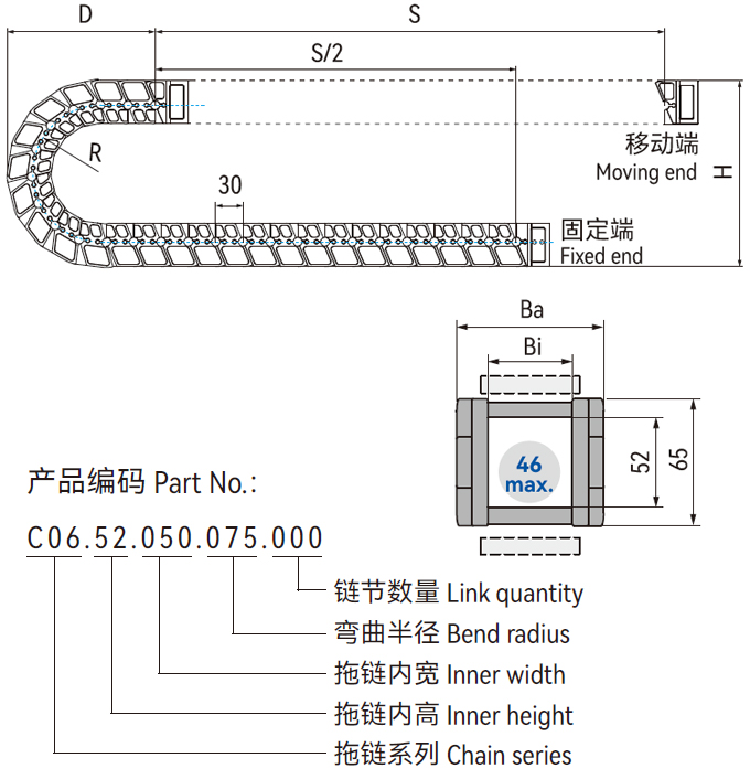 C06.52轻音型电缆拖链采用特殊结构设计,使用寿命长;由于拖链采用圆弧外形设计以及短节距链节采用弹性元件连接降低了拖链弯转过程中的振动,适合低噪音、高速与无尘室应用。