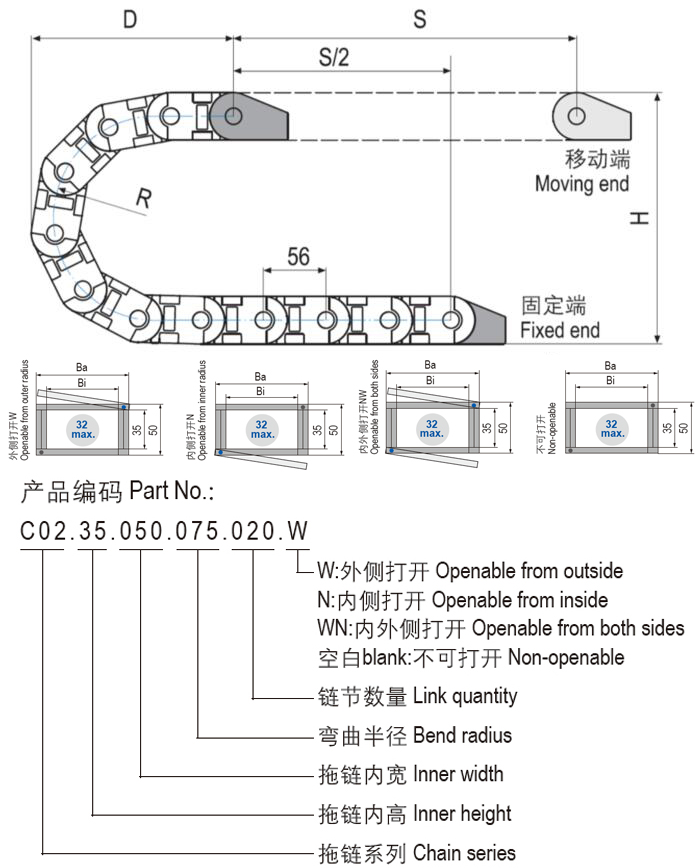 C02.35通用型塑料拖链是应用范围广泛的产品,简单而多功能的组装结合坚固性,高强度配合更安静的运动,更长的电缆寿命和许多安装选项