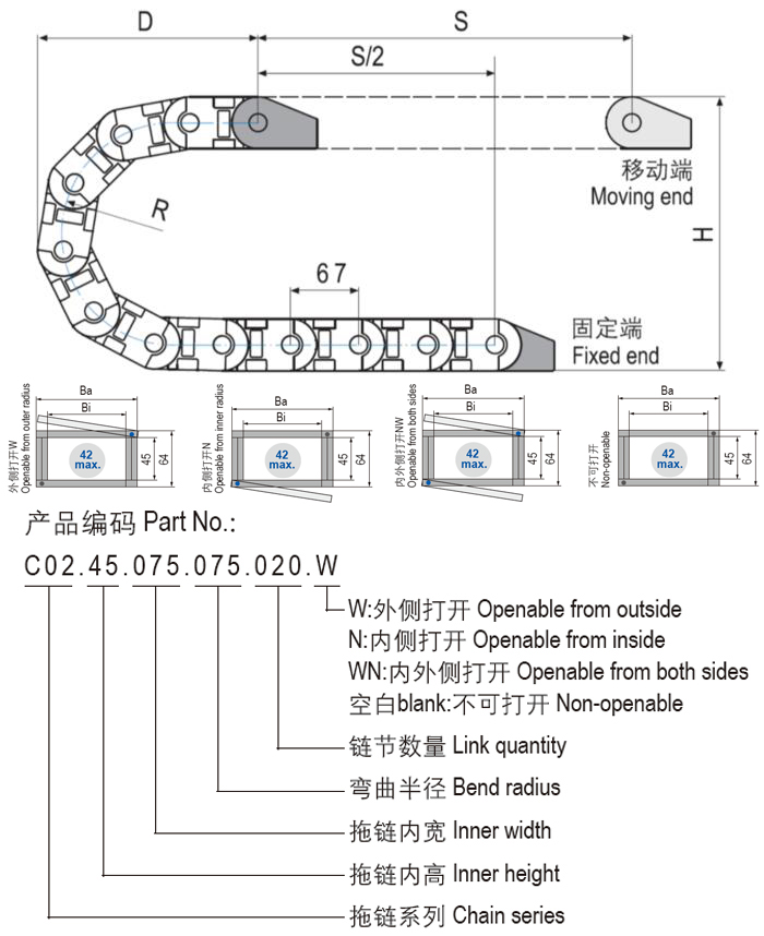 C02.45通用型塑料拖链是应用范围广泛的产品,简单而多功能的组装结合坚固性,高强度配合更安静的运动,更长的电缆寿命和许多安装选项