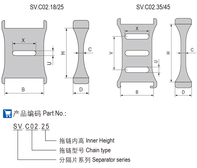 ● 配合竖分隔片使用将电缆拖链内空间上下分层布置